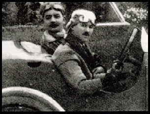 Siempre sobriamente, GOUX posa tras su victoria en el I Grand Prix de Italia 1921, en Brescia. También su copiloto/mecánico, Lebouc, se empeña en salir en la foto. El auto es un Ballot 3,0 litros y su promedio fue de casi 145 Km/h
